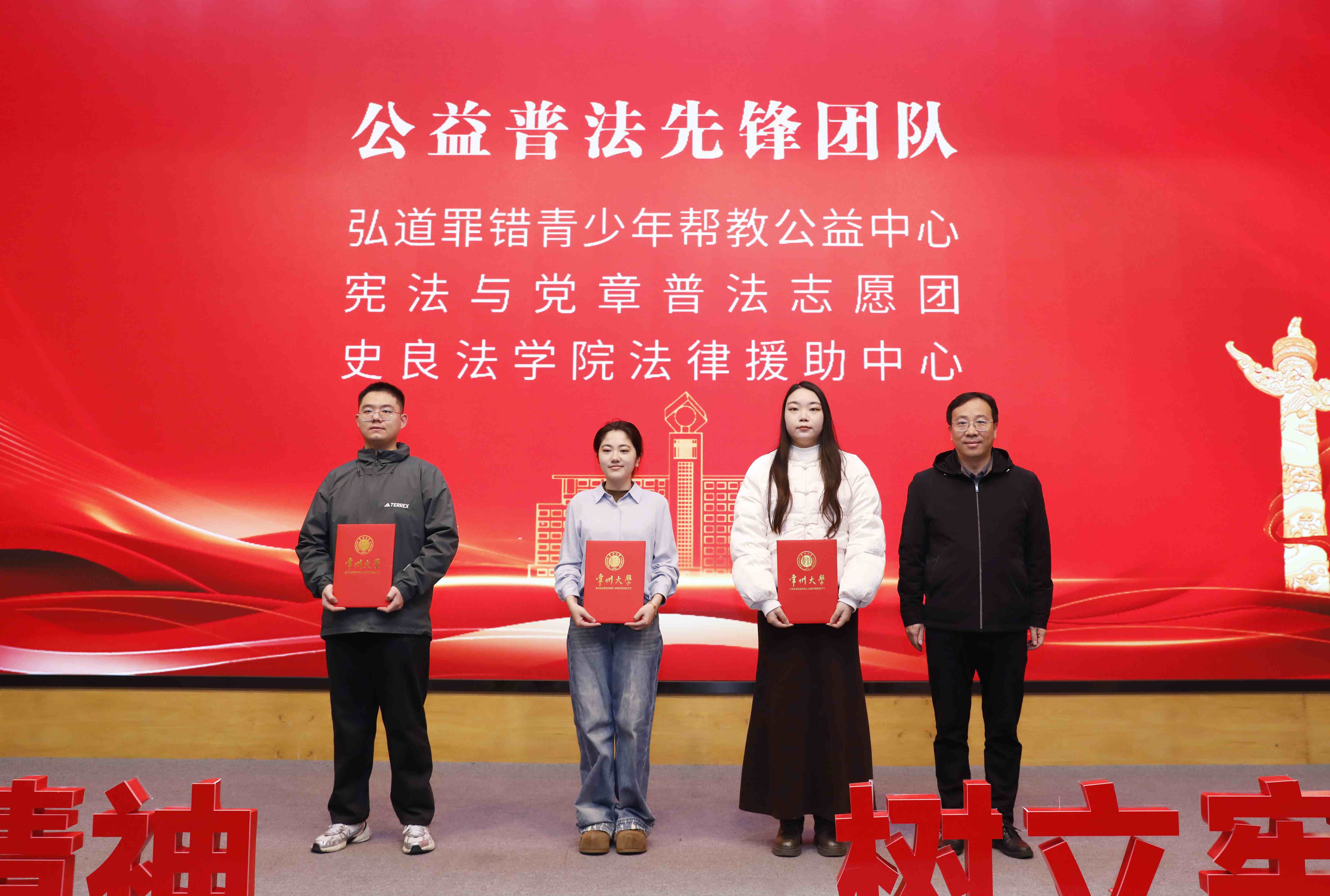 活动现场举行了庄严的宪法宣誓仪式,并对普法工作中的辛勤付出与积极贡献的团队和师生代表进行了表彰。学生代表陈颖现场宣读了《大学生尊法守法倡议书》,呼吁青年学子自觉学习宪法、践行法治,争做社会主义法治的忠实崇尚者和坚定捍卫者。弘道罪错青少年帮教公益中心负责人刘芳硕同学以“用脚步丈量责任,我的普法那些事儿”为题,分享了普法宣传的亲身经历,展现了青年在法治传播中的温度与力量。