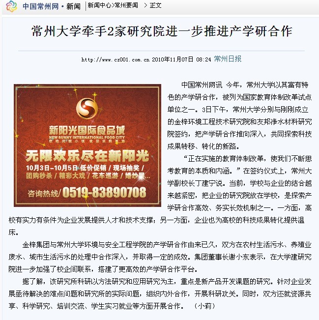 中国常州网讯 今年,常州大学以其富有特色的产学研合作,被列为国家教育体制改革试点单位之一。3日下午,常州大学分别与刚刚成立的金梓环境工程技术研究院和友邦净水材料研究院签约,把产学研合作推向深入,共同探索科技成果转移、转化的新路。