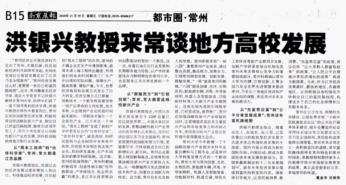 “常州经济在开放经济时代走在了苏州、无锡后面,但在创新经济时代却异军突起,先知先觉地以引智促发展走在了江苏乃至全国前列”,“常州经济发展这么好,更需要一张自己的富民路线图”。近日,常州籍著名经济学家、南京大学党委书记洪银兴教授在常州大学,给师生们讲了一堂不同寻常的经济学课。洪银兴教授在报告中着重指出,常州应加快创新型经济发展、积极培育国家战略性新兴产业、制定自己的富民路线图、继续引进领军型人才;常州大学也要适应战略性新兴产业的发展,用科技创新助推地方和行业发展。