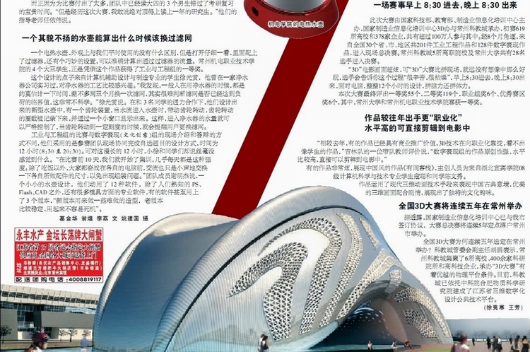 这4个来自常州大学环境艺术设计、工业设计专业的大学生突发奇想,在这次“3D大赛”决赛中为科教城设计了一座“3D科学技术馆”,希望“3D大赛”能够长期落户常州。有趣的是,鼠标、BRT、京剧脸谱、“和谐号”列车,这几个看似毫无关联的事物,被巧妙地糅合到一起,成为了“3D馆”的重要元素。