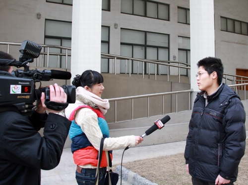 常州电视台 就报告内容采访我校大学生通讯社副社长、化工083班杜明育