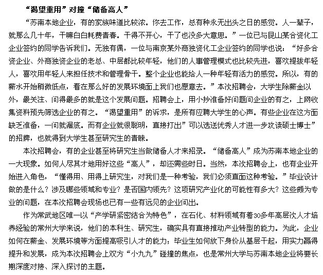 作为常武地区唯一以“产学研紧密结合为特色”,在石化、材料领域有着30多年高层次人才培养经验的常州大学来说,他们的本科生、研究生,确实具有直接推动产业转型的能力。为此,企业如何在薪金、发展环境等方面提高吸引人才的能力;毕业生如何放下身价从基层干起,用实力赢得提升和发展,成为本次招聘会上双方“小九九”碰撞的焦点,也是常州大学与苏南本地企业将要长期深度对接、深入探讨的主题。