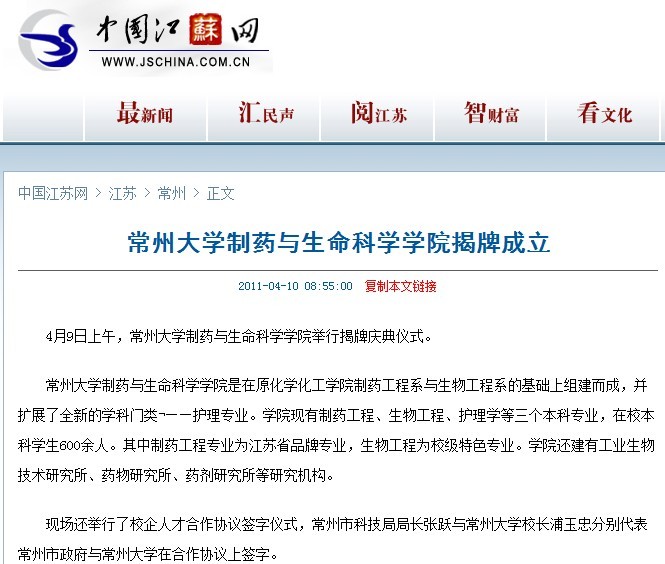 常州大学制药与生命科学学院揭牌成立