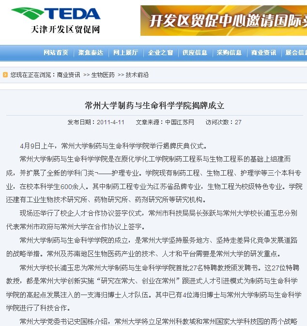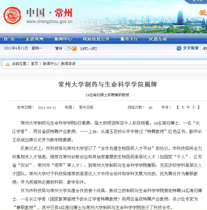 作为市科技局与常州大学共建合作的首个成果,新成立的制药与生命科学学院首批特聘24名海归博士、一名长江学者(国家教育部授予的长江学者特聘教授)和两位省级特聘产业教授,共27位专家为“兼职教授”,其中已有4位海归博士与常州大学制药与生命科学学院进行了科技合作。