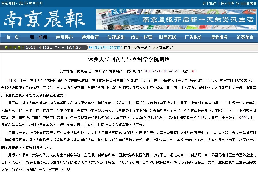 据悉,今后常州大学将依托制药与生命科学学院,立足常州科教城和常州国家大学科技园的两个战略平台,通过与常州市科技局、常州乃至苏南地区生物医药企业的合作,高起点、高标准地把制药与生命科学学院建设成常州大学的人才特区、“政产学研用”合作的实践特区和市场化办学的试验特区,为常州生物医药和卫生事业的发展做出新的更大的贡献。朱劼 陆燕青 葛金华