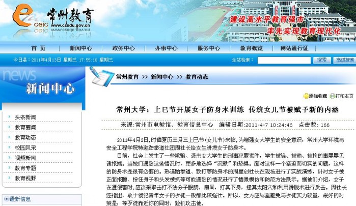 2011年4月2日,时值夏历三月三上巳节(女儿节)来临,为增强女大学生的安全意识,常州大学环境与安全工程学院特邀跆拳道社团周社长给女生讲授女子防身术。