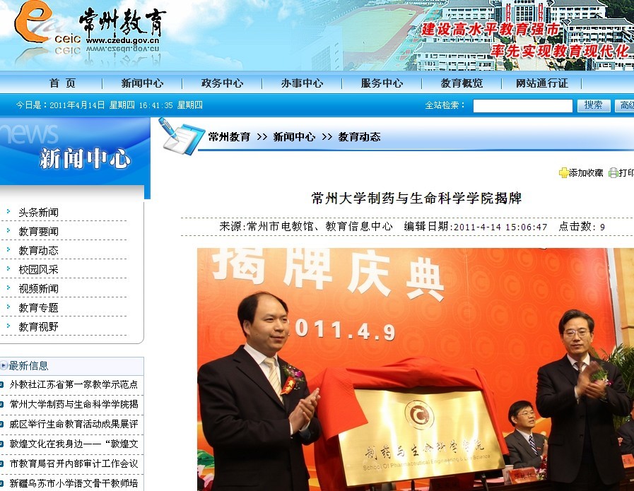 4月9日上午,常州大学制药与生命科学学院举行揭牌庆典仪式。常州市人民政府副市长王成斌、科技局局长张跃,长江学者邓林红教授,南京工业大学药学院院长、江苏省药物研究所所长卢定强教授,江苏省省级特聘产业教授曹利民、杨国军;亚邦集团、常州佳尔科药业集团有限公司、江苏中威药业有限公司、常州千红生化制药股份有限公司、常州方圆制药有限公司、常州制药厂有限公司、常州四药制药有限公司等本地医药企业领导出席庆典。