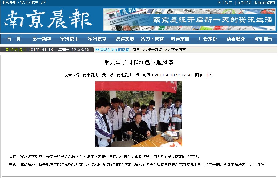 南京晨报报道常州风筝民间艺人张才正传艺机械学院大学生