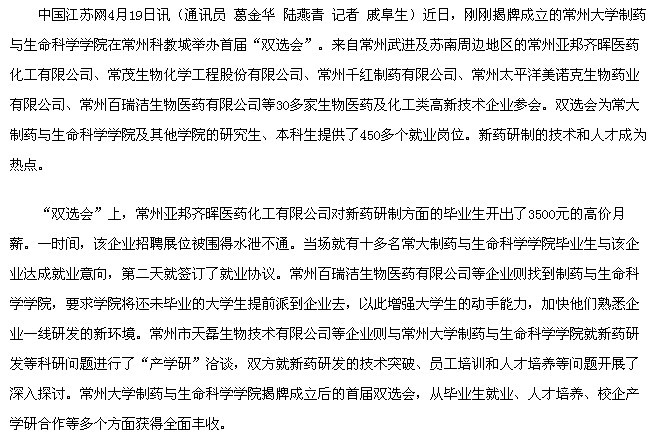 “双选会”上,常州亚邦齐晖医药化工有限公司对新药研制方面的毕业生开出了3500元的高价月薪。一时间,该企业招聘展位被围得水泄不通。当场就有十多名常大制药与生命科学学院毕业生与该企业达成就业意向,第二天就签订了就业协议。常州百瑞洁生物医药有限公司等企业则找到制药与生命科学学院,要求学院将还未毕业的大学生提前派到企业去,以此增强大学生的动手能力,加快他们熟悉企业一线研发的新环境。常州市天磊生物技术有限公司等企业则与常州大学制药与生命科学学院就新药研发等科研问题进行了“产学研”洽谈,双方就新药研发的技术突破、员工培训和人才培养等问题开展了深入探讨。常州大学制药与生命科学学院揭牌成立后的首届双选会,从毕业生就业、人才培养、校企产学研合作等多个方面获得全面丰收。