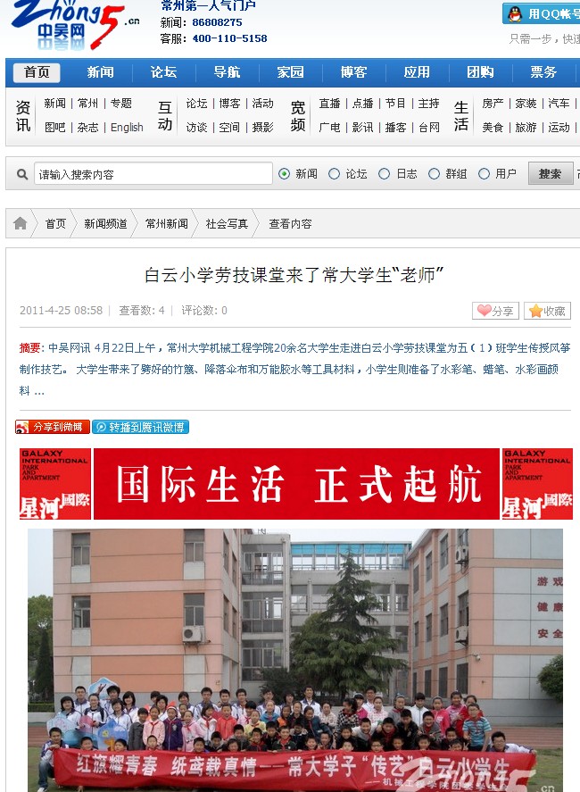 王彩芳和常州台记者裴玲报道:昨天(4、22),常州大学机械工程学院20多名大学生走进白云小学劳技课堂为五(1)班学生传授风筝制作技艺。大学生向同学们全面生动地讲解了风筝制作过程、历史演变等,有趣的知识配上精心制作的PPT图片演示深得孩子们的欢迎,在知识提问环节中更是气氛热烈。 据了解,大学生是在向常州遥观风筝民间艺人张才正师傅学艺后,经过反复练习,基本“出师”后进行的此次活动。