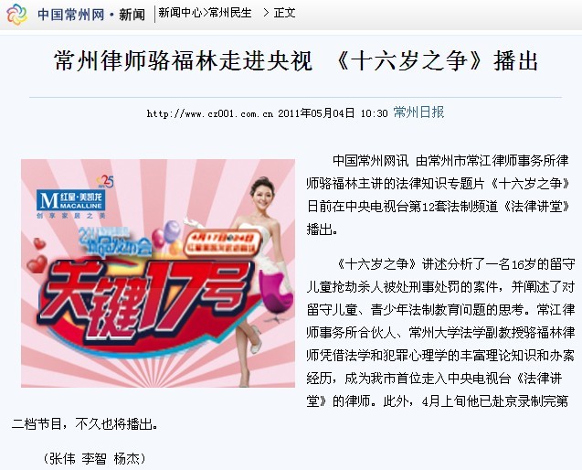 常州日报、中国常州网:常州律师骆福林走进央视《十六岁之争》播出