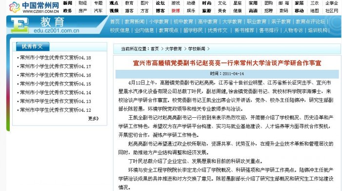 中国常州网:宜兴市高塍镇党委副书记赵亮亮一行来常州大学洽谈产学研合作事宜