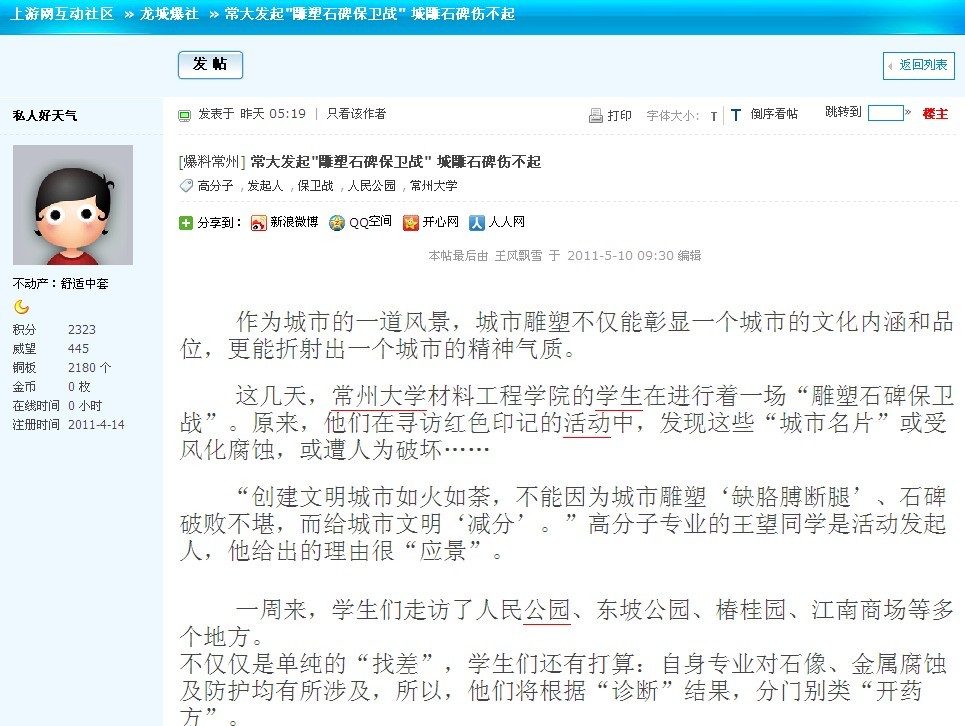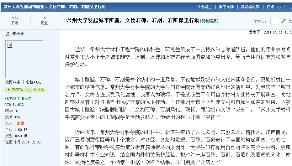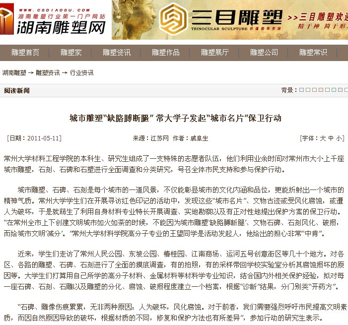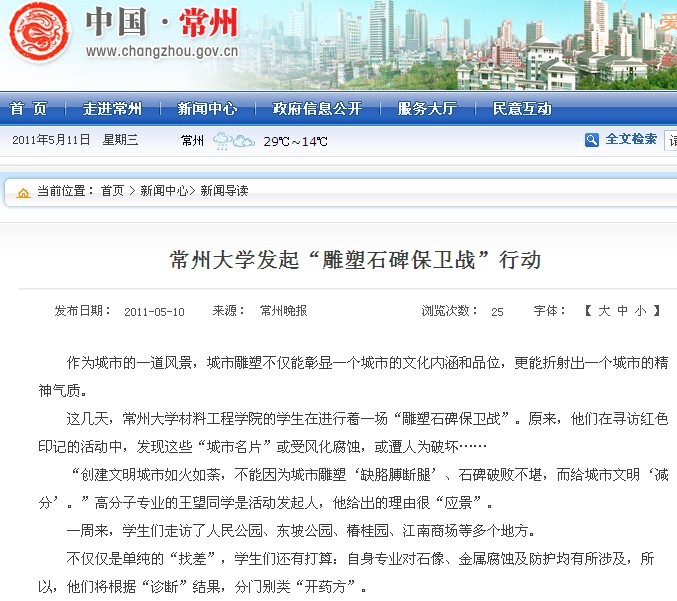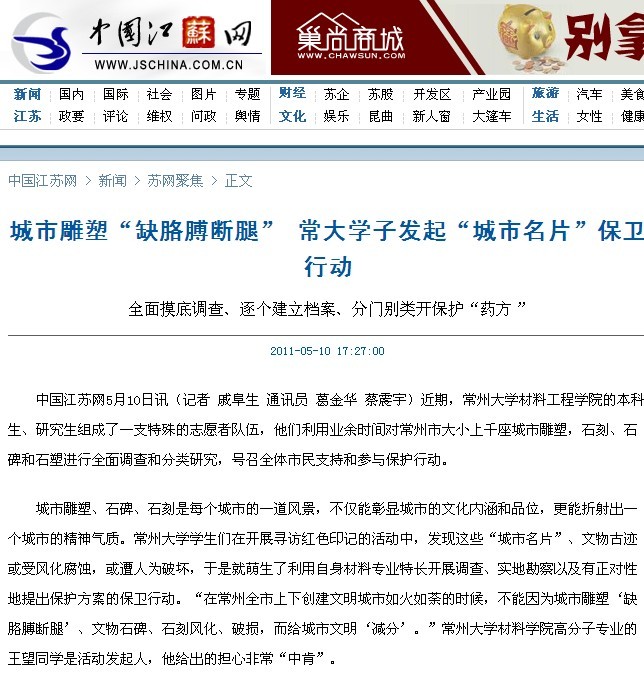 中国江苏网、常州政府网、化龙巷等6家媒体报道我校材料学院大学生雕塑保护行动