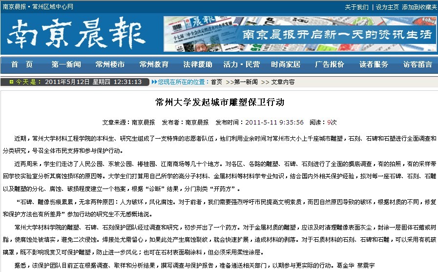 近期,常州大学材料工程学院的本科生、研究生组成了一支特殊的志愿者队伍,他们利用业余时间对常州市大小上千座城市雕塑,石刻、石碑和石塑进行全面调查和分类研究,号召全体市民支持和参与保护行动。