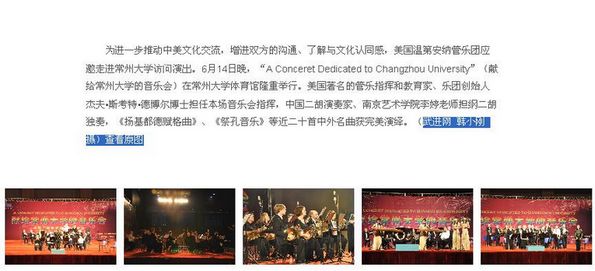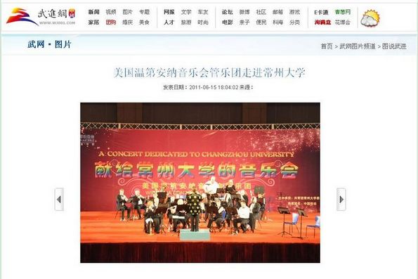 为进一步推动中美文化交流,增进双方的沟通、了解与文化认同感,美国温第安纳管乐团应邀走进常州大学访问演出。6月14日晚,“A Conceret Dedicated to Changzhou University”(献给常州大学的音乐会)在常州大学体育馆隆重举行。美国著名的管乐指挥和教育家、乐团创始人杰夫•斯考特•德博尔博士担任本场音乐会指挥,中国二胡演奏家、南京艺术学院李婷老师担纲二胡独奏,《扬基都德赋格曲》、《祭孔音乐》等近二十首中外名曲获完美演绎。