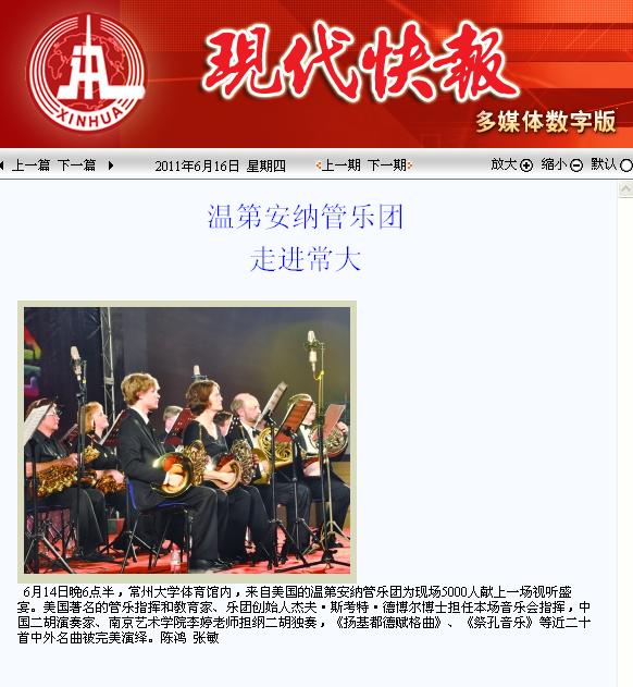 6月14日晚6点半,常州大学体育馆内,来自美国的温第安纳管乐团为现场5000人献上一场视听盛宴。美国著名的管乐指挥和教育家、乐团创始人杰夫·斯考特·德博尔博士担任本场音乐会指挥,中国二胡演奏家、南京艺术学院李婷老师担纲二胡独奏,《扬基都德赋格曲》、《祭孔音乐》等近二十首中外名曲被完美演绎。陈鸿 张敏