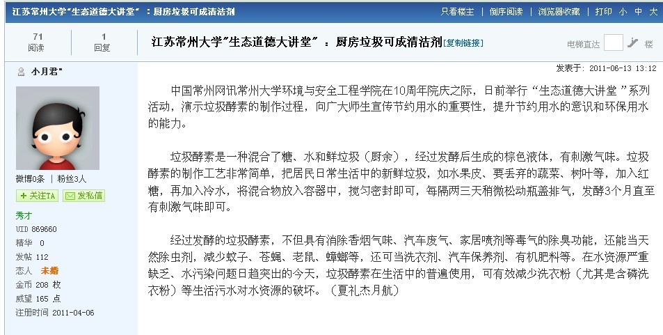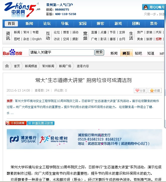 摘要: 常州大学环境与安全工程学院在10周年院庆之际,日前举行“生态道德大讲堂”系列活动,演示垃圾酵素的制作过程,向广大师生宣传节约用水的重要性,提升节约用水的意识和环保用水的能力。 垃圾酵素是一种混合了糖、水 ...
