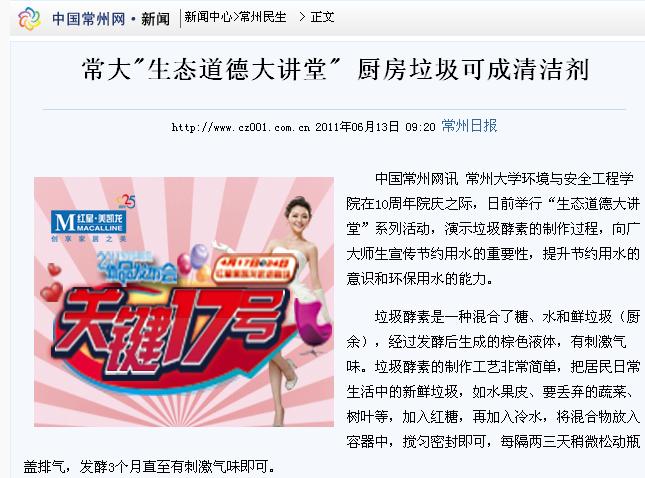 中国常州网讯 常州大学环境与安全工程学院在10周年院庆之际,日前举行“生态道德大讲堂”系列活动,演示垃圾酵素的制作过程,向广大师生宣传节约用水的重要性,提升节约用水的意识和环保用水的能力。