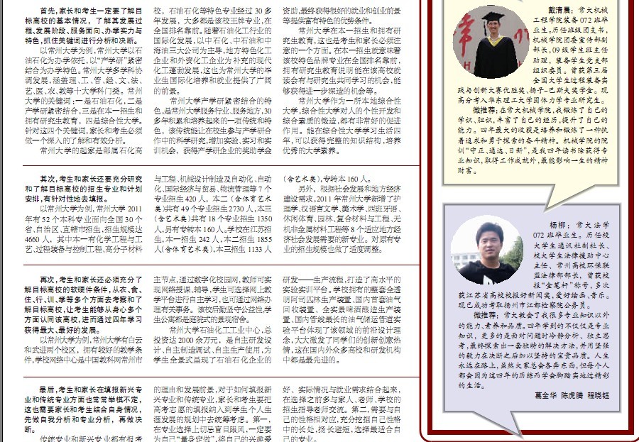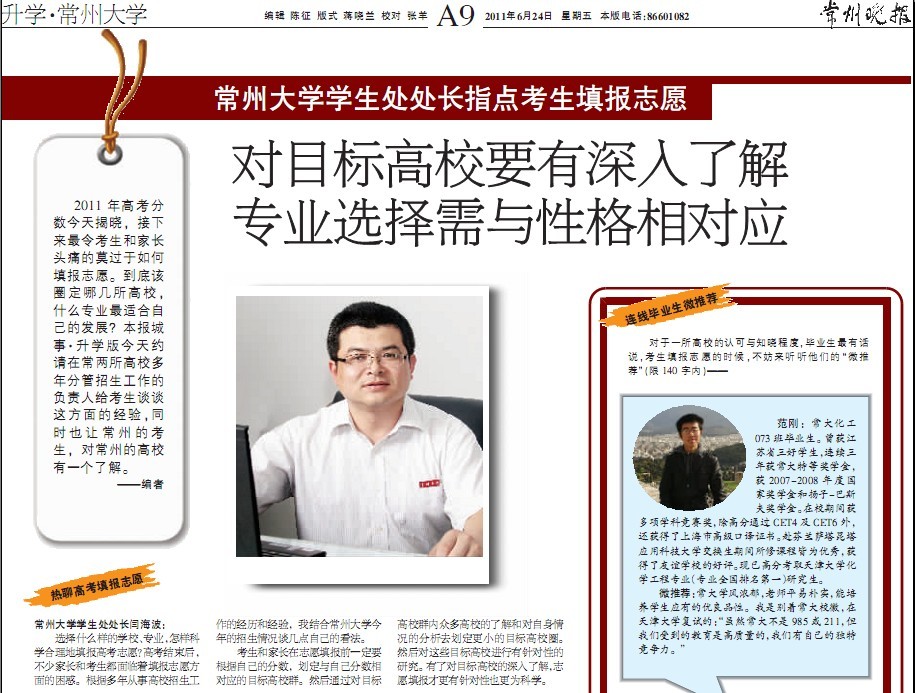 今日(6月24日),《常州晚报》城事·升学版以“常州大学学生处处长指点考生填报志愿:对目标高校要有深入了解,专业选择需与性格相对应”为题,以填报常州大学为例对2011年考生志愿填报的热点和难点进行了全面解析。