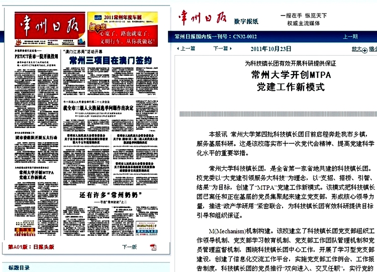 近日,《常州日报》在头版以“为科技镇长团有效开展科研提供保证:常州大学开创MTPA党建工作新模式”为题,深度报道了我校校党委以“大党建引领服务大科技”为理念,以“支招、搭桥、引智、结果”为目标,创建“MTPA”党建工作新模式的重要举措。报道了我校以科技镇长团为突破口,全面落实市十一次党代会精神,着力提高党建科学化水平的创新理念、机制和做法。文章对我校科技镇长团这个全省第一家省地共建的科技镇长团的创新理念和成绩进行了全面深入的介绍、分析和报道。