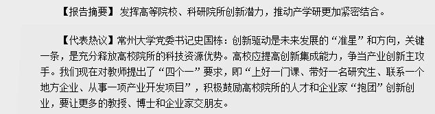 【代表热议】常州大学党委书记史国栋:创新驱动是未来发展的“准星”和方向,关键一条,是充分释放高校院所的科技资源优势。高校应提高创新集成能力,争当产业创新主攻手。我们现在对教师提出了“四个一”要求,即“上好一门课、带好一名研究生、联系一个地方企业、从事一项产业开发项目”,积极鼓励高校院所的人才和企业家“抱团”创新创业,要让更多的教授、博士和企业家交朋友。