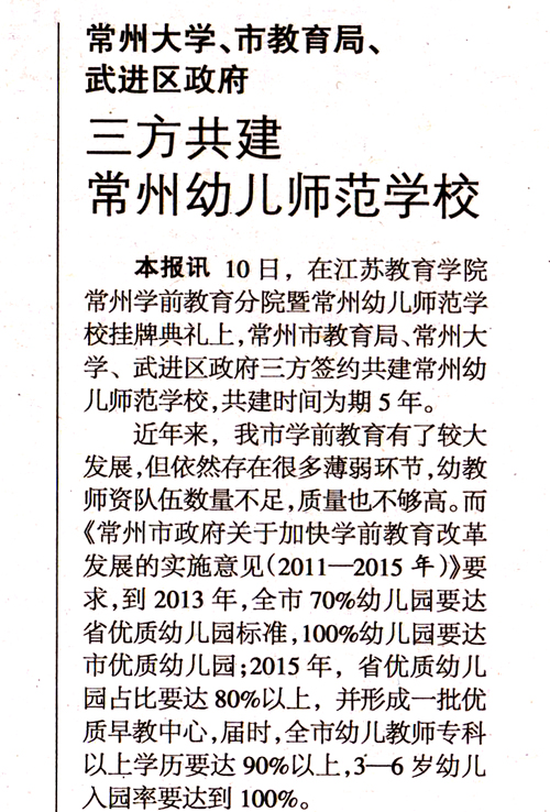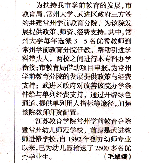 近年来,我市学前教育有了较大发展,但仍有薄弱环节,主要表现为:幼教师资队伍数量不足,综合素质不够高。我市决定依托武进区教师进修学校,增挂“江苏教育学院常州学前教育分院”、“常州幼儿师范学校”两块牌子,切实加大幼师培养力度,并由常州大学、市教育局、武进区政府签约共建,在政策、人才、科研、经费等方面提供有效保障。根据三方《协议》,常州大学将与学前教育分院进行本专科办学衔接,并每年选派数名优秀教师到学前教育分院任教;市教育局将优先考虑学前教育分院的师资培养、招生就业等事项;区政府将优先考虑学前教育分院招生计划的落实和毕业生就业安排等。