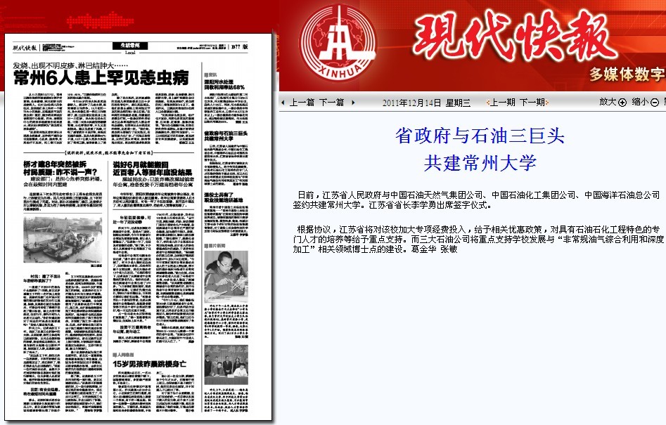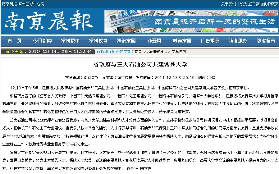 12月9日下午5点,江苏省人民政府与中国石油天然气集团公司、中国石油化工集团公司、中国海洋石油总公司共建常州大学签字仪式在南京举行。