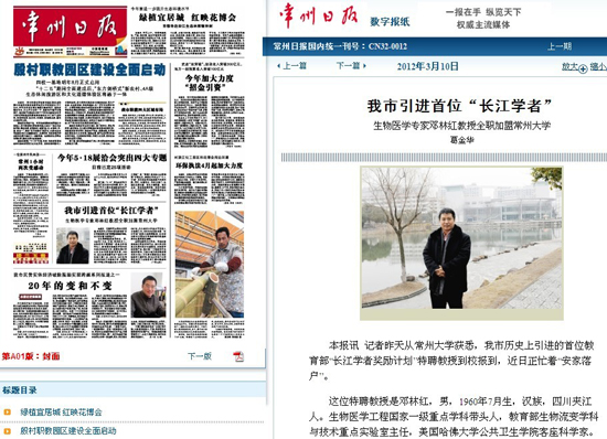 常州日报关于邓林红教授全职加盟我校的报道