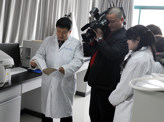 江苏教育电视台记者深入我校制药与生命科学学院陈新教授实验室采访