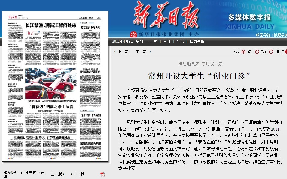 4月9日,《新华日报》以“常州开设大学生‘创业诊所’”为题,深度报道了我校创立常州首家大学生“创业诊所”,邀请企业家、职业经理人、专家学者、职能部门坐堂问诊,为怀揣创业梦的毕业生指点迷津的创新举措和成功经验。《新华日报》文章全文如下: