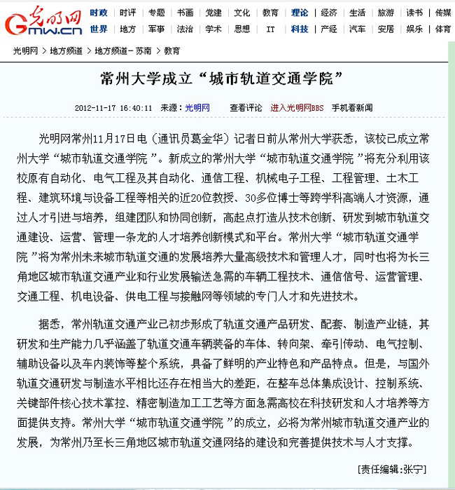 据悉,常州轨道交通产业已初步形成了轨道交通产品研发、配套、制造产业链,其研发和生产能力几乎涵盖了轨道交通车辆装备的车体、转向架、牵引传动、电气控制、辅助设备以及车内装饰等整个系统,具备了鲜明的产业特色和产品特点。但是,与国外轨道交通研发与制造水平相比还存在相当大的差距,在整车总体集成设计、控制系统、关键部件核心技术掌控、精密制造加工工艺等方面急需高校在科技研发和人才培养等方面提供支持。常州大学“城市轨道交通学院”的成立,必将为常州城市轨道交通产业的发展,为常州乃至长三角地区城市轨道交通网络的建设和完善提供技术与人才支撑。
