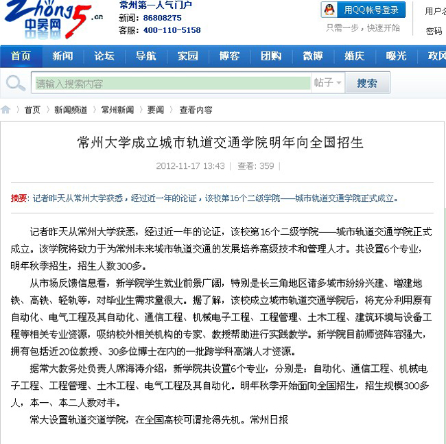 常州大学成立城市轨道交通学院 明年向全国招生