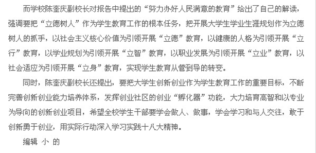 而学校陈奎庆副校长对报告中提出的“努力办好人民满意的教育”给出了自己的解读,强调要把“立德树人”作为学生教育工作的根本任务,把开展大学生学业生涯规划作为立德树人的抓手,以社会主义核心价值为引领开展“立德”教育,以健康的人格为引领开展“立行”教育,以学业规划为引领开展“立智”教育,以职业发展为引领开展“立业”教育,以社会适应为引领开展“立身”教育,实现学生教育从管到导的转变。