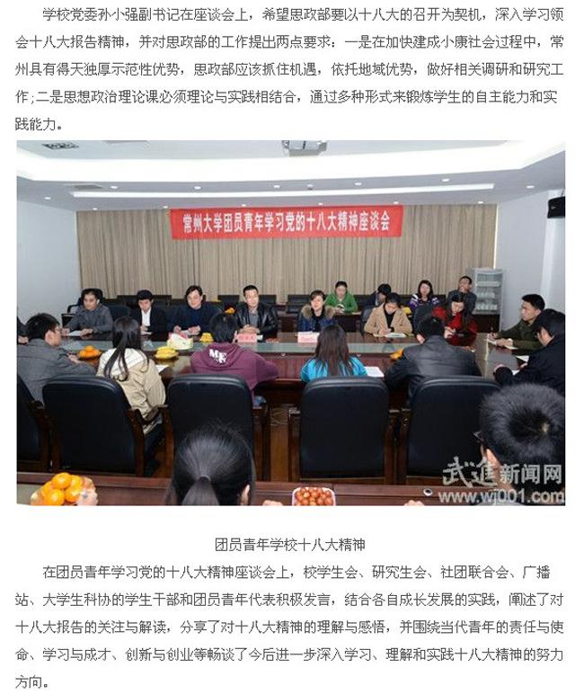 常州武进网讯(郁涛 记者 镇晓丹)为庆祝党的第十八次全国代表大会胜利召开,引领全校学习贯彻十八大精神,近日,常州大学思想政治理论课教学研究部以及校团委分别召开“学习十八大精神”座谈会,深入学习领会十八大报告精神。