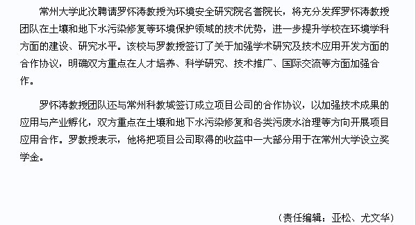 常州大学此次聘请罗怀涛教授为环境安全研究院名誉院长,将充分发挥罗怀涛教授团队在土壤和地下水污染修复等环境保护领域的技术优势,进一步提升学校在环境学科方面的建设、研究水平。该校与罗教授签订了关于加强学术研究及技术应用开发方面的合作协议,明确双方重点在人才培养、科学研究、技术推广、国际交流等方面加强合作。