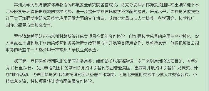 常州大学此次聘请罗怀涛教授为环境安全研究院名誉院长,将充分发挥罗怀涛教授团队在土壤和地下水污染修复等环境保护领域的技术优势,进一步提升学校在环境学科方面的建设、研究水平。该校与罗教授签订了关于加强学术研究及技术应用开发方面的合作协议,明确双方重点在人才培养、科学研究、技术推广、国际交流等方面加强合作。