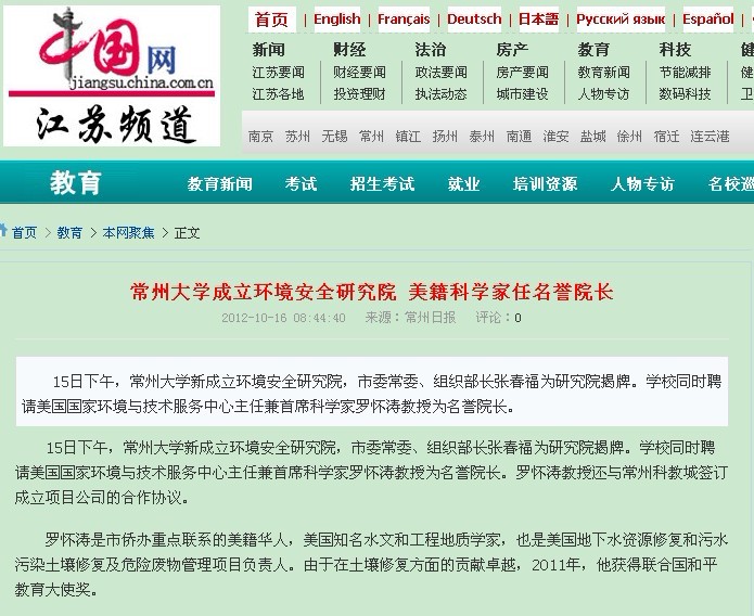 常州大学成立环境安全研究院 美籍科学家任名誉院长