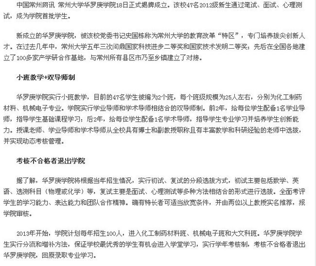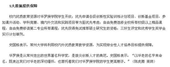 新成立的华罗庚学院,被该校党委书记史国栋称为常州大学的教育改革“特区”,专门培养拔尖创新人才。在过去几年中,常州大学五年三次问鼎国家科技进步二等奖和国家技术发明二等奖;先后在全国各地建立了100多家产学研合作基地,与常州所有县区市乃至乡镇建立了对接。