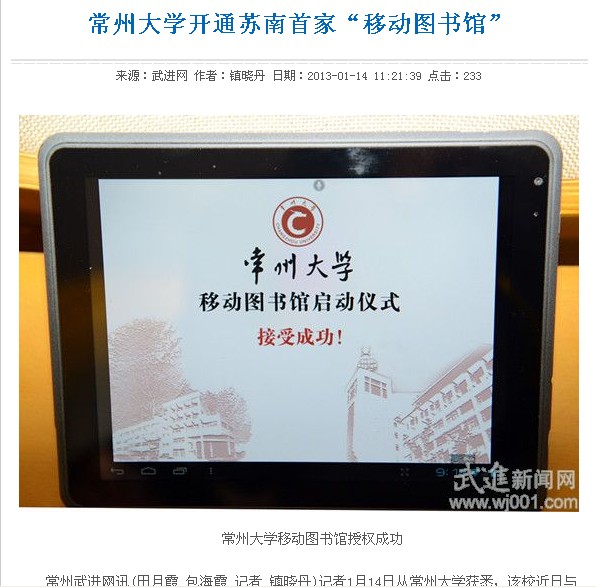 常州武进网讯(田月霞 包海霞 记者 镇晓丹)记者1月14日从常州大学获悉,该校近日与北京超星集团共同合作推出的“常州大学移动图书馆”正式开通,这在苏南地区尚属首家。