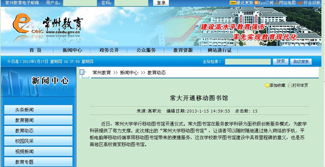 近日,常州大学举行移动图书馆开通仪式。常大图书馆在服务教学科研方面积极创新服务模式,为教学科研提供了有力支撑。此次推出的“常州大学移动图书馆”,让读者可以随时随地通过接入网络的手机、平板电脑等移动终端享用移动图书馆带来的便捷服务,这在学校数字图书馆建设中具有里程碑的意义,也是苏南地区高校首家移动图书馆。(田月霞 包海霞 曹奕)