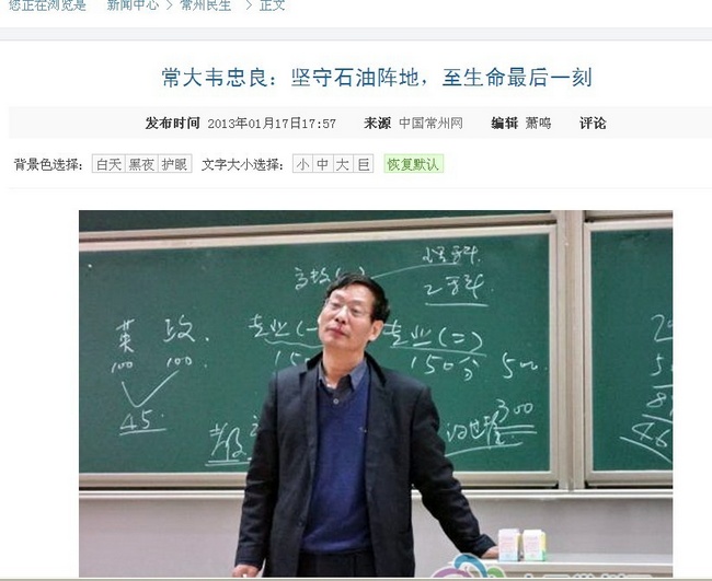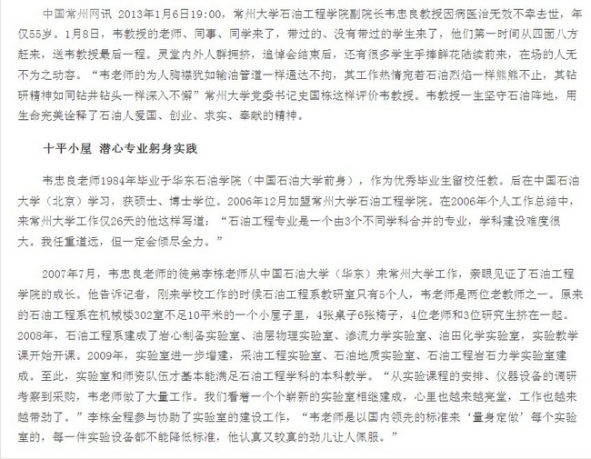 中国常州网讯 2013年1月6日19:00,常州大学石油工程学院副院长韦忠良教授因病医治无效不幸去世,年仅55岁。1月8日,韦教授的老师、同事、同学来了,带过的、没有带过的学生来了,他们第一时间从四面八方赶来,送韦教授最后一程。灵堂内外人群拥挤,追悼会结束后,还有很多学生手捧鲜花陆续前来,在场的人无不为之动容。“韦老师的为人胸襟犹如输油管道一样通达不拘,其工作热情宛若石油烈焰一样熊熊不止,其钻研精神如同钻井钻头一样深入不懈”常州大学党委书记史国栋这样评价韦教授。韦教授一生坚守石油阵地,用生命完美诠释了石油人爱国、创业、求实、奉献的精神。