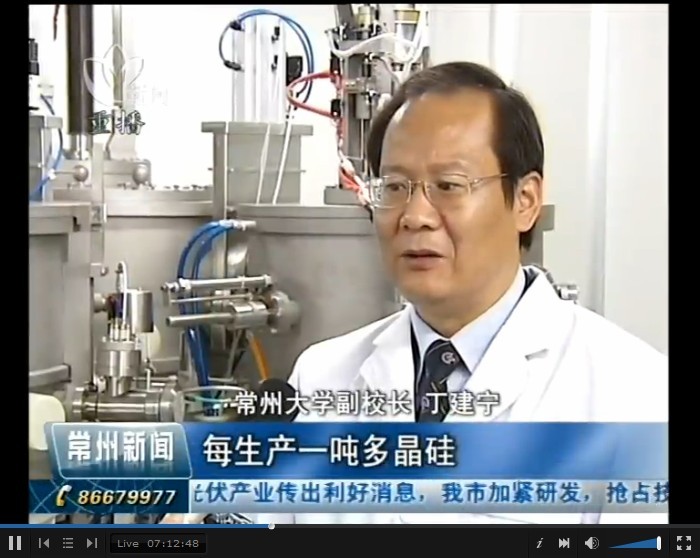 常州大学副校长丁建宁:“把四氯化硅转化成生产多晶硅的原材料三氯氢硅,这样我们的生产就形成密闭循环生产,这样就没有污染物的排放,变废为宝,这样多晶硅生产成本大幅降低。”