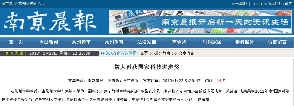 从常州大学获悉,由常州大学作为第一单位、副校长丁建宁教授主持完成的“多晶硅冷氢化生产核心专用加热合成反应器成套工艺装备”成果荣获2012年度“国家科学技术进步二等奖”,这是常州大学第四次获此殊荣。这一成果保持了该校每两年获得1项国家科技奖的势头。