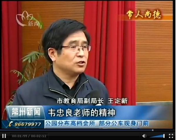 常州市教育局副局长王定新说:“韦忠良老师他的精神对我们全市的教育工作者有一种启示作用,我们希望全市的教育工作者在我们常州市的道德建设当中进一步的来优化我们的言行,提升我们的道德水准。”