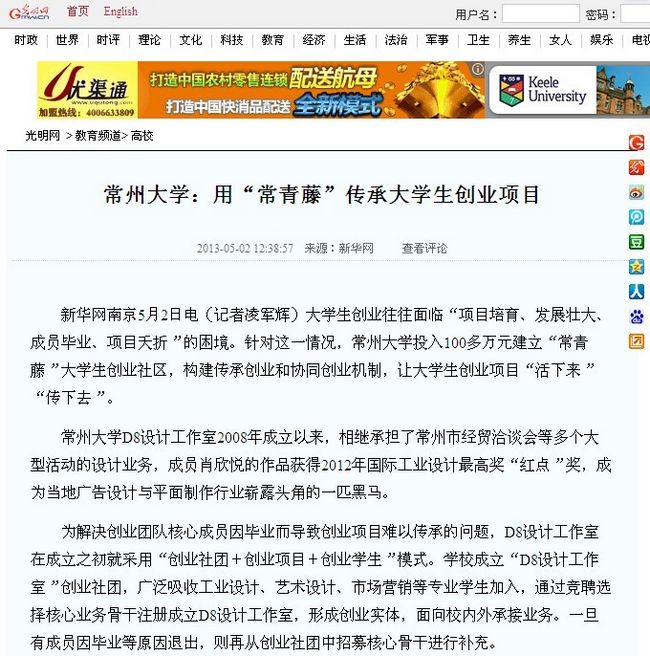 新华网南京5月2日电(记者凌军辉)大学生创业往往面临“项目培育、发展壮大、成员毕业、项目夭折”的困境。针对这一情况,常州大学投入100多万元建立“常青藤”大学生创业社区,构建传承创业和协同创业机制,让大学生创业项目“活下来”“传下去”。