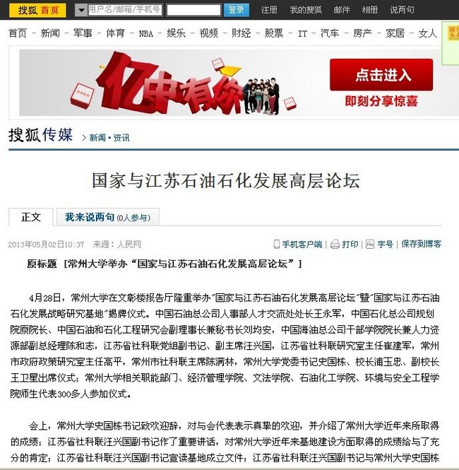 4月28日,常州大学在文彰楼报告厅隆重举办"国家与江苏石油石化发展高层论坛"暨"国家与江苏石油石化发展战略研究基地"揭牌仪式。中国石油总公司人事部人才交流处处长王永军,中国石化总公司规划院原院长、中国石油和石化工程研究会副理事长兼秘书长刘均安,中国海油总公司干部学院院长兼人力资源部副总经理陈和志,江苏省社科联党组副书记、副主席汪兴国,江苏省社科联研究室主任崔建军,常州市政府政策研究室主任高平,常州市社科联主席陈满林,常州大学党委书记史国栋、校长浦玉忠、副校长王卫星出席仪式;常州大学相关职能部门、经济管理学院、文法学院、石油化工学院、环境与安全工程学院师生代表300多人参加仪式。