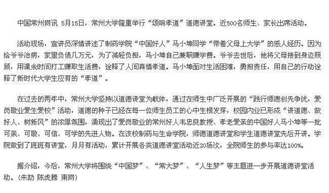 据介绍,今后,常州大学将围绕“中国梦”、“常大梦”、“人生梦”等主题进一步开展道德讲堂活动。