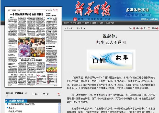 “晚期胃癌,最多活不过一年!”面对医生的宣判,常州大学石油工程学院副院长韦忠良教授唯一的心愿是:在讲台上多站一会儿。手术结束后,他说服家人,毅然回到课堂,最终倒在了自己为之奉献了28年的讲台上,年仅55岁。在日前举行的韦忠良教授事迹报告会上,人们深深感受到他“许身孺子平生愿,三尺讲台写春秋”的信念和情怀。 为了送恩师最后一程,学生娄爽坐了11个小时的火车,专门从山东菏泽赶来;远在新疆塔里木油田的吉鹏程,花了5个小时穿越沙漠,又用5个小时赶到机场,却没能见上老师最后一面,失声痛哭。 韦老师有一句口头禅:“教书是个良心活,一时放松就会影响学生一辈子。”韦忠良能喊出每一届每一个学生的名字,熟知每个学生的家庭情况,了解每个学生的个性特长。为了给学生答疑解惑,他专门找了一间实验室,和他的办公室在一层楼,不管是周末和假期,同学们都能在第一时间找到他。 常州大学石油工程学院研究生黄静说起韦老师,含泪道“亦师亦父”!在去年的一堂课上,她发现韦老师弓着背,脸色煞白,刚讲几句就不得不一只手撑着讲台,另一只手按着上腹部,大口大口地喘气。她见状急切地说:“老师,你坐下来讲课吧,您累了!”“不坐。老师的职业,是站立的事业。”韦老师坚持站着上课,最后实在撑不住时,才坐在凳子上继续讲,一堂课下来出了一身汗。手术后,他身体消瘦,连说话都没力气了,还一直骗学生说只是个小手术,过几天就能出院了。看到老师坐在病床上,捂着肚子忍着剧痛指导学生做毕业论文,几个同学强忍泪水,出门后抱头痛哭。 常大石油工程学院老师顾军锋收拾韦老师的遗物时,发现满满几大箱听课笔记,分门别类贴着学院每个青年教师的名字。翻开贴着自己名字的笔记本,顾老师忍不住落泪。河南油田组织部的一位同志获悉韦老师去世,十分震惊:“韦老师去年还到我这里推荐大学生,风风火火,一点儿没看出他生病了呀!”也正是因为学生的高素质加上韦老师的韧劲,他所带出的毕业生就业率始终维持在100%。 “老韦的研究方向是油井钻头,他的精神也像钻头一样过硬。他有专利,也有制造能力,完全可以‘赚大钱’,可他却把所有精力都放在了学科建设和学生培养上。”常州大学党委书记史国栋动情地说,老韦用他的一生坚守了石油阵地,坚守了三尺讲台。 新华日报原文地址:http://xh.xhby.net/newxh/html/2013-05/20/content_772702.htm(编辑 陈虎腾)