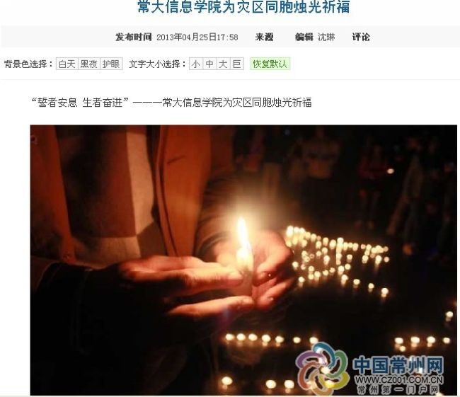 中国常州网讯 4月23日晚9点,常州大学信息学院团委联合校学生会于水月广场进行了“心系灾区 情暖雅安”祈福活动。大家用数百支蜡烛摆成 “雅安 4 20”爱心的形状。在雨中,当所有人双手合拳默默为灾区人民祝福的时候,全场肃静。愿逝者安息、伤者获救,愿抢险救灾的英雄们平安。