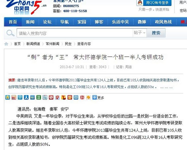 中吴网讯 又是一年毕业季,对于毕业生来说,从学校毕业后的出路一是找到一份适合的工作,二是选择继续深造。随着全国各大高校硕士研究生考试成绩的陆续公布,常州大学怀德学院考研录取人数再获突破。继去年录取85人后,今年怀德学院2013届毕业生共有124人上线,目前已有105人收到相关高校录取通知书,创学院历届研究生考试成绩新高。特别是化工096班32人中有16人考取研究生,占班级人数的50%。